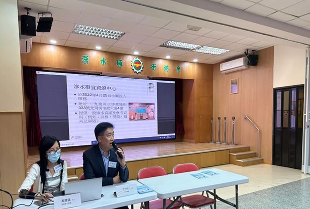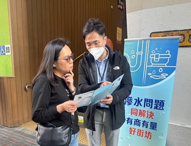 In addition to the establishment of Regional Joint Offices, the Food and Environmental Hygiene Department has set up the Customer Service Team (CS Team) in December 2021. CS Team aims to disseminate information about water seepage in buildings, engage with property management agents, foster understanding of water seepage matters, owners' obligations and the work of the Government, and advise on practical ways to settle water seepage conflicts. In this connection, members of the CS team will convene seminars and conduct promotional activities to the public so as to deliver the aforesaid messages.